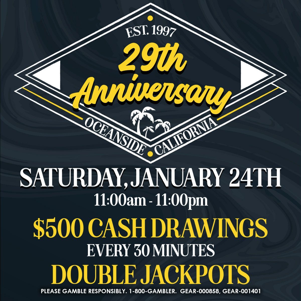 Join us as Ocean’s 11 marks our 29th Anniversary with an all-day party you won’t want to miss. From 11am–11pm, enjoy $500 cash drawings every 30 minutes, double jackpots, big games lighting up the screens, and that electric nightlife vibe you know and love.