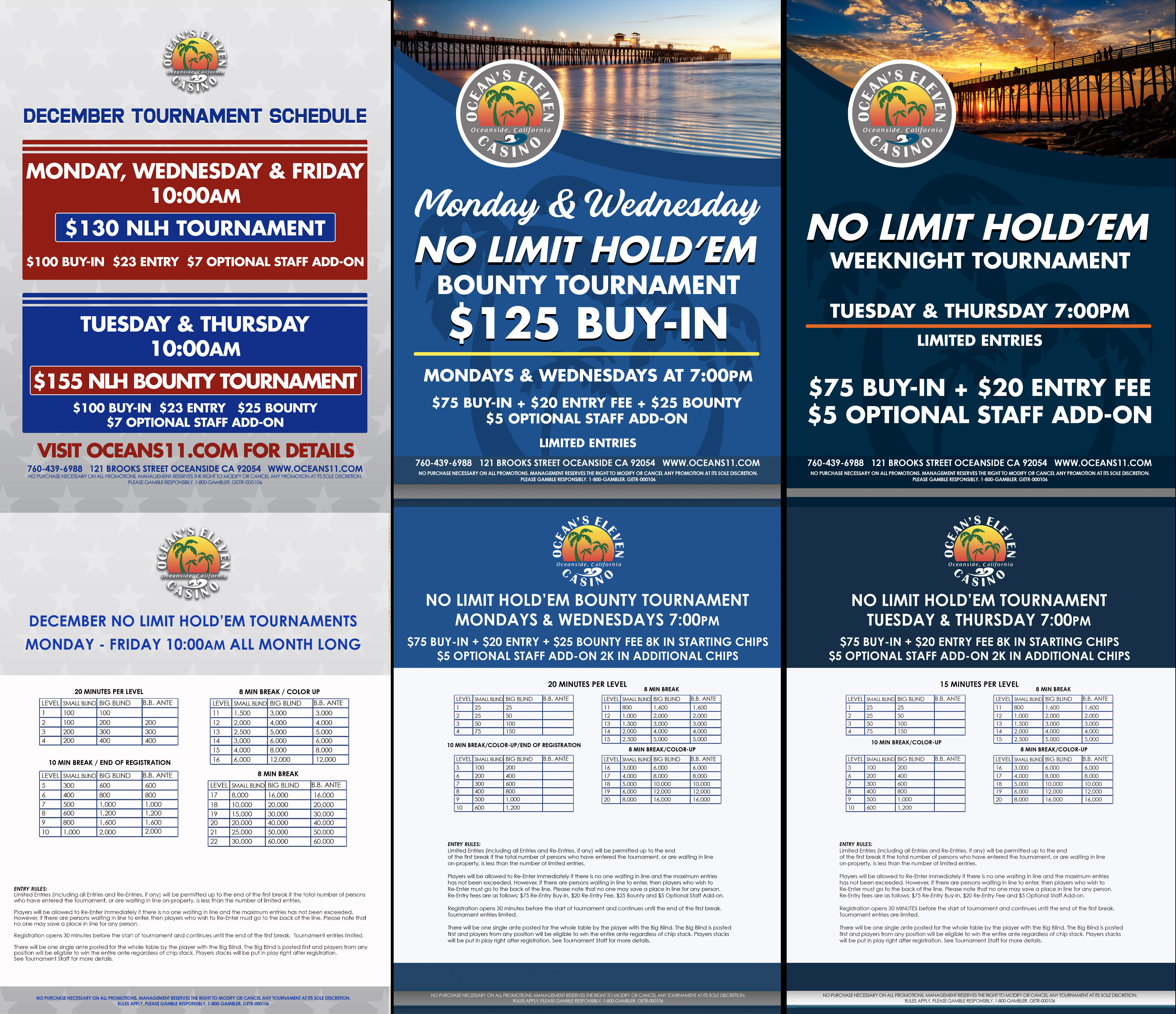 Must be 21 to play. Oceans 11 Casino reserves the right to cancel promotions at its sole discretion. All promotions and jackpots: no purchase necessary. I.D may be required to receive any payment. PLEASE GAMBLE RESPONSIBLY. Visit www.problemgambling.ca.gov or call 1-800-GAMBLER.